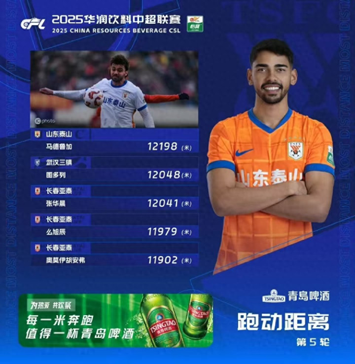 中超跑动榜上出现了有趣的一幕,山东泰山队的后腰马德鲁加高居榜首,前五名当中有三名长春亚泰的球员。有人开玩笑的说,因为马德鲁加玩命的跑,带动了长春亚泰球员跟着玩命的跑,有三名球员就这样华丽的跑进了跑动榜的前五名。